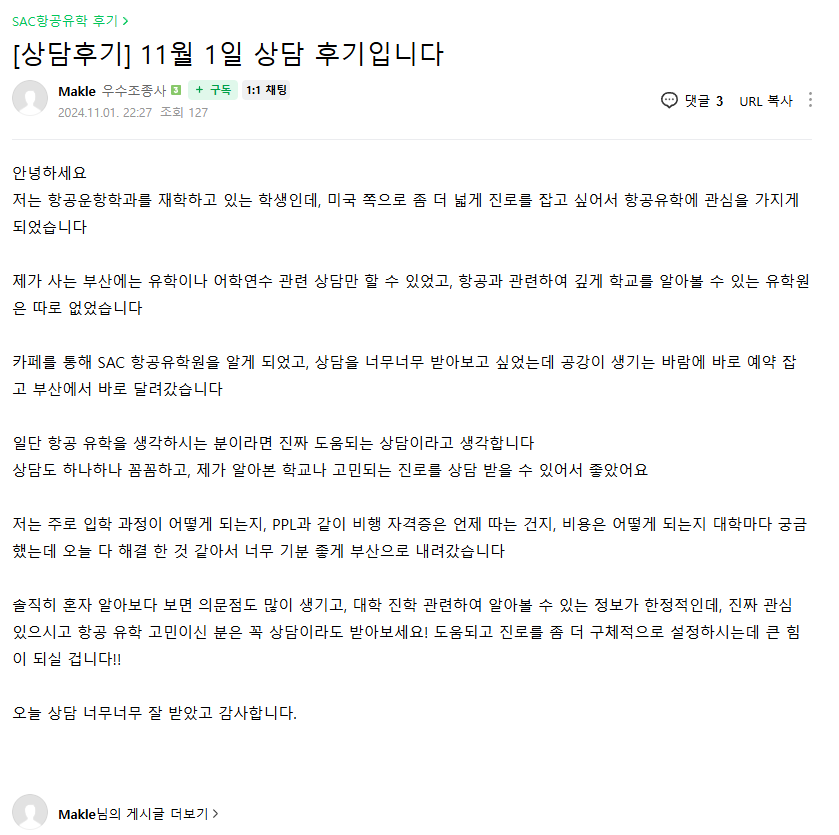 솔직히 혼자 알아보다 보면 의문점도 많이 생기고, 대학 진학 관련하여 알아볼 수 있는 정보가 한정적인데, 진짜 관심 있으시고 항공 유학 고민이신 분은 꼭 상담이라도 받아보세요! 도움되고 진로를 좀 더 구체적으로 설정하시는데 큰 힘 이 되실 겁니다!!